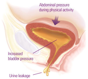 loss of urine that occurs with increased intra-abdominal pressure, i.e. coughing, sneezing, laughing, etc.